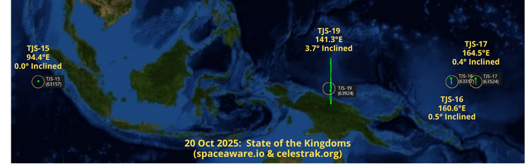 20 Oct 2025: China repositioned TJS-15 (King of the West) (63157) 0.3° to the east (94.1° to 94.4°). The maneuvers occurred from 11-30 September and increased the point of closest approach (POCA) with USA 315 (SBIRS GEO 5) (48618) from ~112km to nearly 400km. The other three kings, TJS-16 (King of the East) (63397), and TJS-17 (King of the North) (63524) and TJS-19 (King of the South) (63924) remain in their previous positions as reported in the 31 Aug 2025 edition of the Flash. The mission of these satellites remains unknown. China announced all four had the identical mission and would be “mainly used to verify multi-band and high-speed satellite communication technology.”