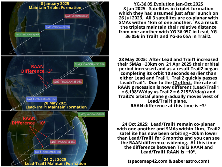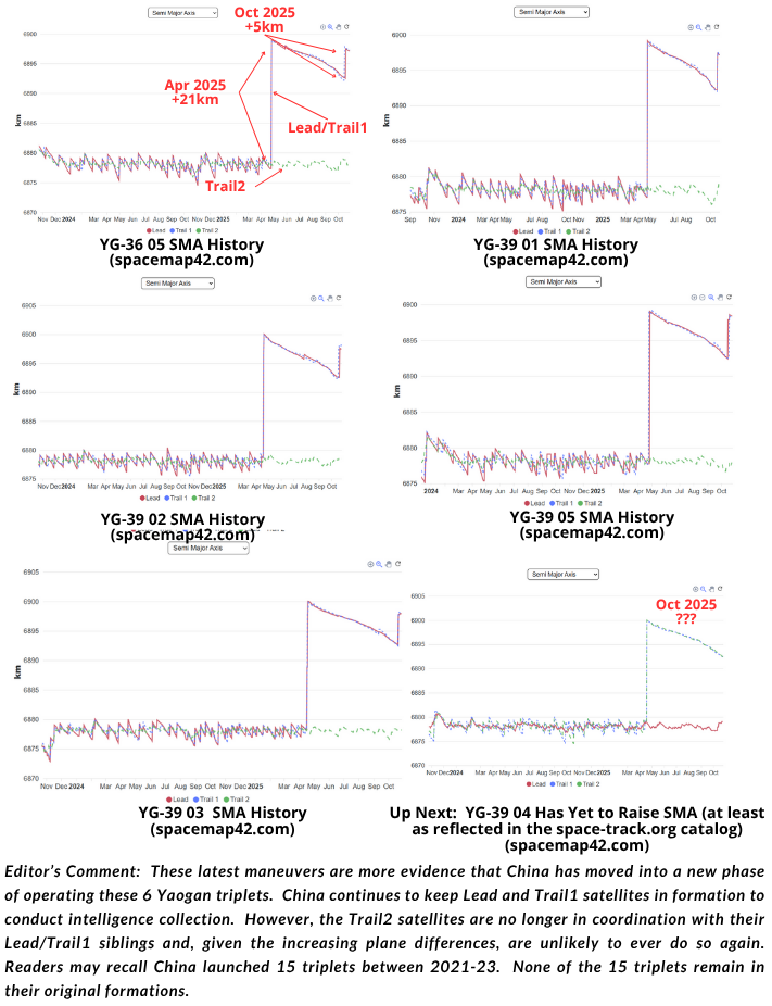 24 Oct 2025: When last we checked in on the YG-36 05 and YG-39 01-05 triplets, both the Lead and Trail1 satellites had increased their average altitudes (SMA) from just under 500km to ~520km. Chinese space operators did not increase the SMA for any of the related Trail2 satellites. As a result, the previously carefully maintained satellite triplet formations quickly devolved with the Lead and Trail1 satellites maintaining their relative positions from one another while the Trail2 satellites were left in lower orbits with shorter orbital periods and a different RAAN precession rate. Nearly 6 months later China has again adjusted the SMAs for Lead and Trail1 satellites for YG-36 05 (57452/57454), YG-39 01 (57731/57728), YG-39 02 (57889/57890), YG-39 03 (57990/57988) and YG-39 05 (58558/58559). All 8 satellites increased their SMA between 14-17 October. The maneuvers were relatively small compared to the ~20km boost in April, the average SMA increase was only 5.5km. Chinese space operators were very precise, after the maneuvers Lead and Trail1 satellites had an average SMA variance of just 320m. As a result, the Lead and Trail1 satellites will maintain their relative distance from one another. While China has not maneuvered any of the Trail2 satellites associated with these formations above 500km, they are continuing to maintain their previous orbits and I assume operate independently from their Lead and Trail1 siblings. As of 24 Oct 2025 there were no maneuvers for YG-39 04 in the publicly available catalog.