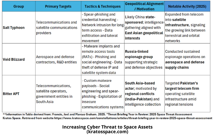 Cyber threats to the space sector are accelerating in scale and sophistication, blending espionage, criminal, and ideological motives that directly challenge global space resilience.