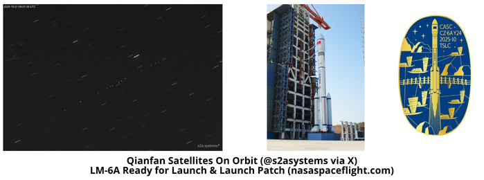 17 Oct: China launched a Long March-6A with the sixth batch of 18 SpaceSail satellites from Taiyuan. According to official sources, the SpaceSail Constellation (Qianfan Constellation), is developed by Shanghai SpaceSail Technologies Co., Ltd. to “provide global users with low-latency, high-speed and ultra-reliable satellite broadband internet services.” With this launch there are now has 108 satellites in orbit. This is the first Qianfan launch in 220 days, much longer than the cadence for the first 5 launches (54 days). A significant number of Qianfan satellites appear to have experienced issues in reaching their operational orbits. The increased time between launch 5 and 6 is likely due to troubleshooting. Launch Video.