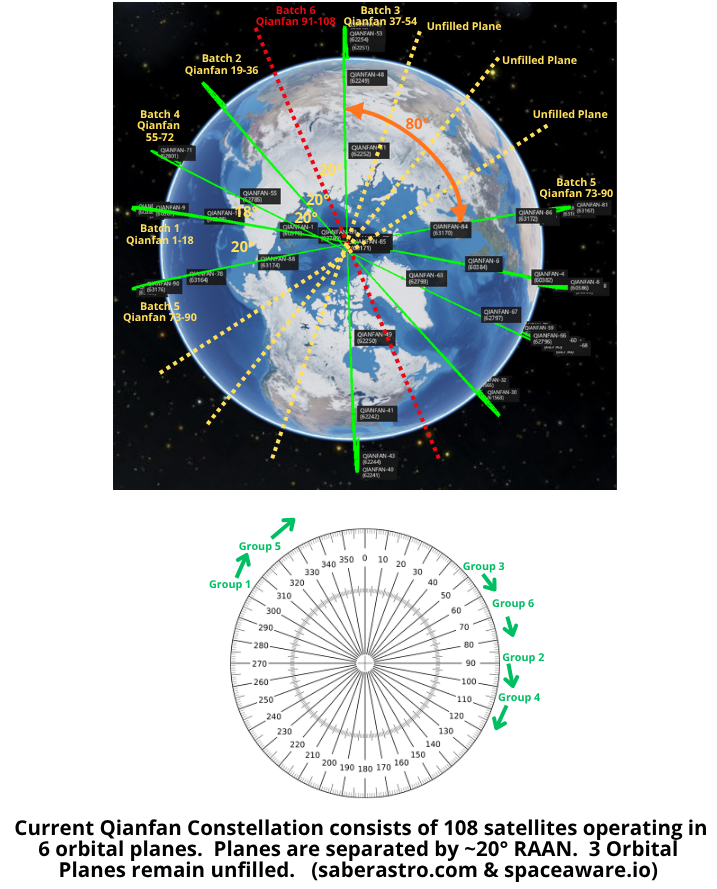 – SpaceSail launched 6th batch Qianfan satellites into the orbital plane between batches 2 & 3 (see graphic). It appears the initial configuration of the Qianfan constellation will be 9 orbital planes separated by 20° of RAAN offset between each plane. With this launch, 6 of the 9 planes are in use. SpaceSail may want to augment batch 2 due to the majority of those satellites failing to reach their operational altitudes.