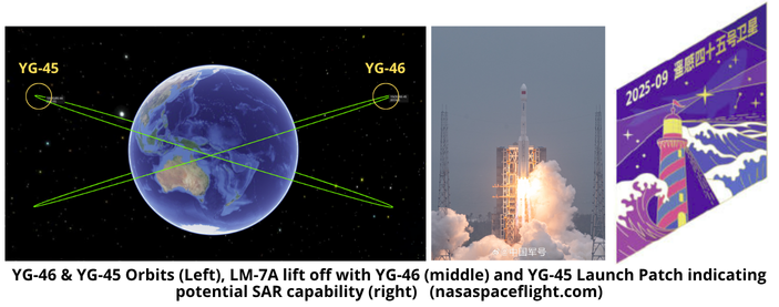 3 Nov 2025: China launched a Long March-7A with the Yaogan-46 (66313) remote sensing satellite from Wenchang. According to official sources, the satellite entered the planned orbit and “will be primarily used in disaster prevention and relief, land resource surveys, hydrology, meteorology, and other related fields”. The 18 SDS has cataloged the satellite in Medium Earth Orbit (MEO) and in a similar orbit as Yaogan-45 (65563) which China launched just 55 days prior (9 Sep 2025). It appears China is establishing a Yaogan remote sensing constellation in MEO. China has not released information regarding any specific sensor types, however the launch patch from YG-45 seemed to indicate an imaging Synthetic Aperture Radar (SAR). Launch Video.