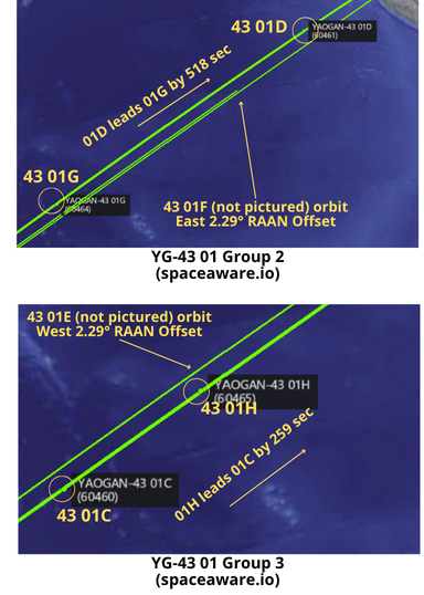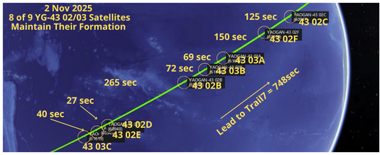 31 Oct 2025: The Yaogan-43 01 formation (60458-60466) continues to change. Back in April I noted that 5 of the 9 satellites had ceased maintaining their average altitudes resulting in a break in formation and increasing RAAN differentials. Revisiting the orbits for all 9 satellites it appears China may be operating them in three separate formations of three satellites. Specifically, Group 1: YG-43 01 B/J/A (60459, 60466, 60458), Group 2: YG-43 01 D/G/F (60461, 60464, 60463), and Group 3: YG-43 01 C/H/E (60460, 60465, 60462). We do not know the specific capabilities of any of the Yaogan-43 satellites, “reportedly these are different satellites from several manufacturers.” China may be creating these sub-groups to test tip-cue capabilities from differing sensor types.