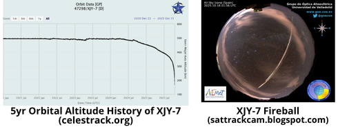 – XJY-7 last maneuvered ~16 Aug 2024 and over the next year its orbit slowly decayed until it re-entered on 16 Oct 2025.