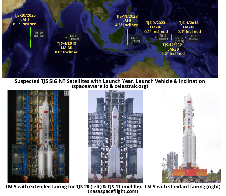 7 Nov 2025: As noted in the 26 October Flash, China launched TJS-20 (66142) on 23 October. After spending a little over a week in Geosynchronous Transfer Orbit (GTO) Chinese space operators circularized TJS-20’s orbit. TJS-20 has now joined the GEO belt and is located at 62.5° E longitude (east of the Arabian Peninsula and west of India). TJS-20’s orbit is inclined 6.0° which is greater than any of the other TJS satellites. China launched TJS-20 using a LM-5 with an extended fairing, the exact same launch configuration used for TJS-11 in February 2024. The China Aerospace Science and Technology (CAST) organization developed TJS-20. Previous TJS satellites also built by CAST include TJS-1 (40892), TJS-4 (44637), TJS-9 (50574), TJS-11 (59020) and TJS-12 (62374) which are assessed to be part of the Qianshao program and SIGINT mission related.