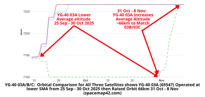 8 Nov 2025: Chinese space operators raised the average altitude of YG-43 03A (65547) to match that of YG-43 03B/C (65545/65546), and the third satellite now has an ~0.7° west RAAN offset from its sibling satellites. Thanks to the J2 effect, the trio are now orbiting in a “triangle” formation and able to perform their radio frequency monitoring and geolocation mission. China has followed a similar deployment pattern for its other RF/Geolocation triplet formations, namely YG-40 02A/B/C (63918, 63919 & 63920), YG-40 01A/B/C (57830, 57831 & 57832) and its 4 sets of YG-31 triplets. YG-40 01 and 02 also have a west RAAN offset of ~0.7°.