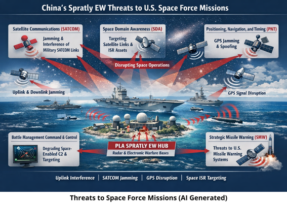 - Space-enabled warfare denial: AMTI states China is positioning the Spratly Islands to disrupt U.S. dependence on GPS, SATCOM, and satellite-linked ISR, thereby directly affecting space-to-force integration.