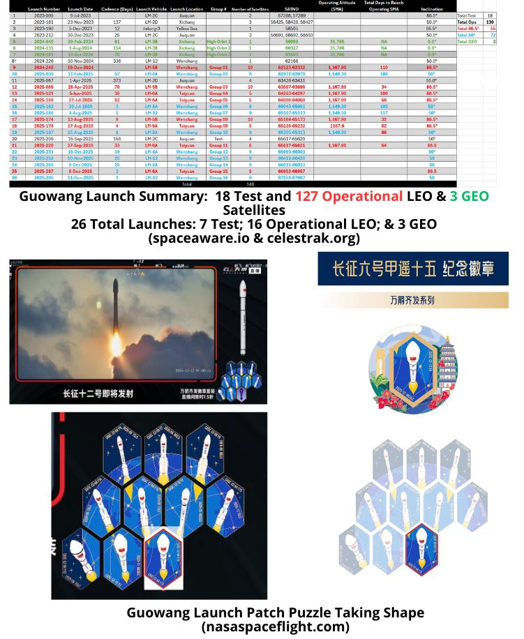 11 Dec 2025: China launched a Long March-12 with 9 Guowang Group 16 satellites (67059-67067) from Wenchang. This launch was into a 50° inclined orbit with the satellites released at ~806km. Over the next 3-4 months China will gradually raise their altitudes to 1,149.3km. Launch Video.