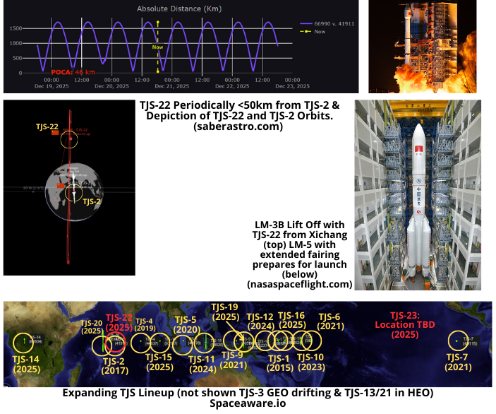 9 Dec 2025: China launched a Long March-3B with the TJS-22 (66990) satellite from Xichang. According to official sources, the satellite entered the planned orbit successfully and “will primarily support services including satellite communication, data transmission, and radio and television broadcasting, as well as conducting relevant technical tests and validations”. On 20 Dec satellite observers noted the satellite had reached geosynchronous orbit and was over 66.5° E with an inclination of 2.0°. At this location it TJS-22 is “near” TJS-2 (41911) which is also at 66.5°E, inclination (0.4°). China launched TJS-2 in 2017 and open source information notes the satellite performs missile warning function. Co-location with TJS-2 may indicate TJS-22 is a replacement for TJS-2…we’ll be watching to see if China re-locates TJS-2 in the coming months. Launch Video.