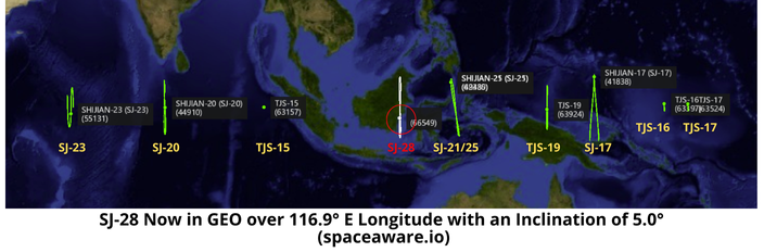 8 Dec 2025: After launching Shijian-28 (66549) on 30 Nov on a Long March-7A, China circularized the satellite’s orbit. SJ-28 is now in geosynchronous orbit settled over 116.9° E longitude (over eastern Borneo) and inclined 5°. China has released no information regarding the mission of SJ-28. See below for graphic showing SJ-28’s location/inclination compared with other Chinese GEO satellites of interest. Launch Video.