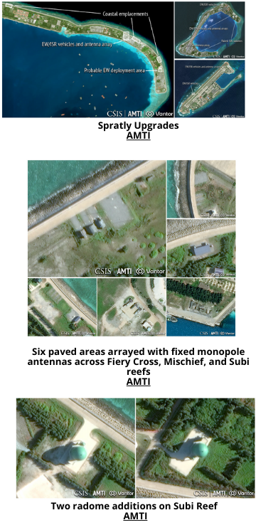 - Installation of new facilities on Fiery Cross, Mischief, and Subi reefs is likely to support vehicle-deployed EW and ISR operations.