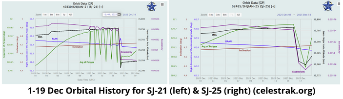 20 Dec 2025: SJ-21 (49330) and SJ-25 (62485) remain in RPO conditions and were recently within <2km of one another. On 15 Dec the two satellites were ~60-65km apart, then both SJ-25 and SJ-21 maneuvered, SJ-25 on 17 Dec and SJ-21 24hrs later. As a result of these maneuvers the satellites came within 1.3km on 18 Dec (thank you COMSPOC_OPS). Amazing images from s2asystems (thank you Roger!) tell the story. s2asystems 20 Dec image reveals the two satellites are close enough to be indistinguishable from ground based optical telescopes. A final image from 22 Dec shows two objects again. Analysis is ongoing, but at this extreme proximity standard two line element set data (TLEs) are insufficient to identify maneuvers from either spacecraft. Recall the two satellites successfully detached from one another in late-November after presumably docking with one another on 2 July 2025. SJ-21 and SJ-25 have continued to operate “near” one another and were separated by <1km during the 1-5 Dec timeframe. The situation remains fluid and I hope to provide a more granular analysis in the next Flash.