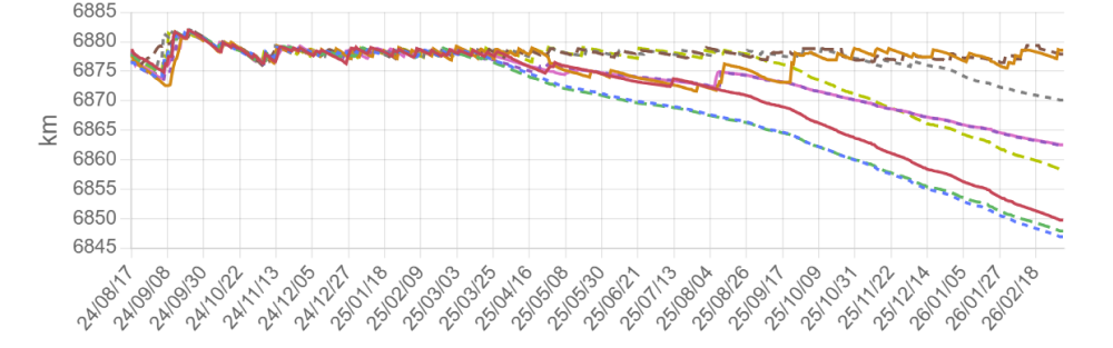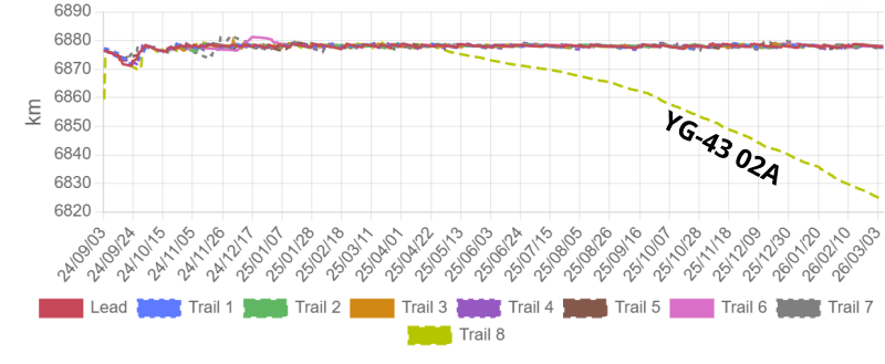 5 Mar 2026: The 9 satellites that make up the YG-43 02 (60945-60950) and YG-43 03 (61617-61619) train remain largely in formation. The one exception is YG-43 02A (60945) which last maneuvered in late-April 2025 and is now orbiting nearly 50km lower than the other 8 satellites. The remaining 8 satellites are maneuvering and remaining within 0.5km in average altitude (SMA). As a result they are closely maintaining their relative positions with one another. China deployed its second series of Yaogan-43 satellites in two batches, the first consisted of 6 YG-43 02 satellites launched on a LM-4B on 3 Sep 2024. The second group consisting of 3 YG-43 03 satellites launched on a LM-2C on 23 Oct 2024. China maneuvered the two groups into a co-planar formation with 02 and 03 satellites forming a single train.