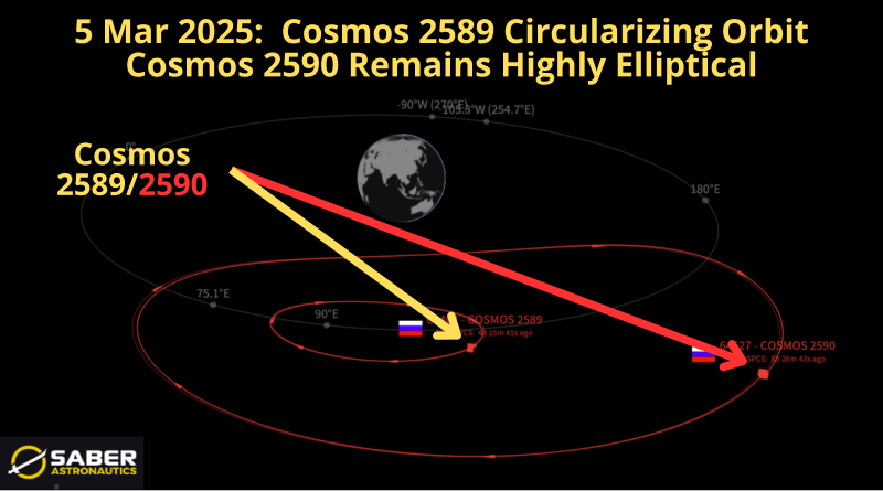 12 Nov 2025 - 4 Mar 2026: Orbital History of Cosmos 2589 (left) & Cosmos 2590 (right) Cosmos 2589 Increased Perigee 10,780km & Decreased Apogee 10,772km. Eccentricity Drops from 0.3649 to 0.1095 Cosmos 2590: No Significant Changes to Perigee, Apogee or Eccentricity (celestrak.org)