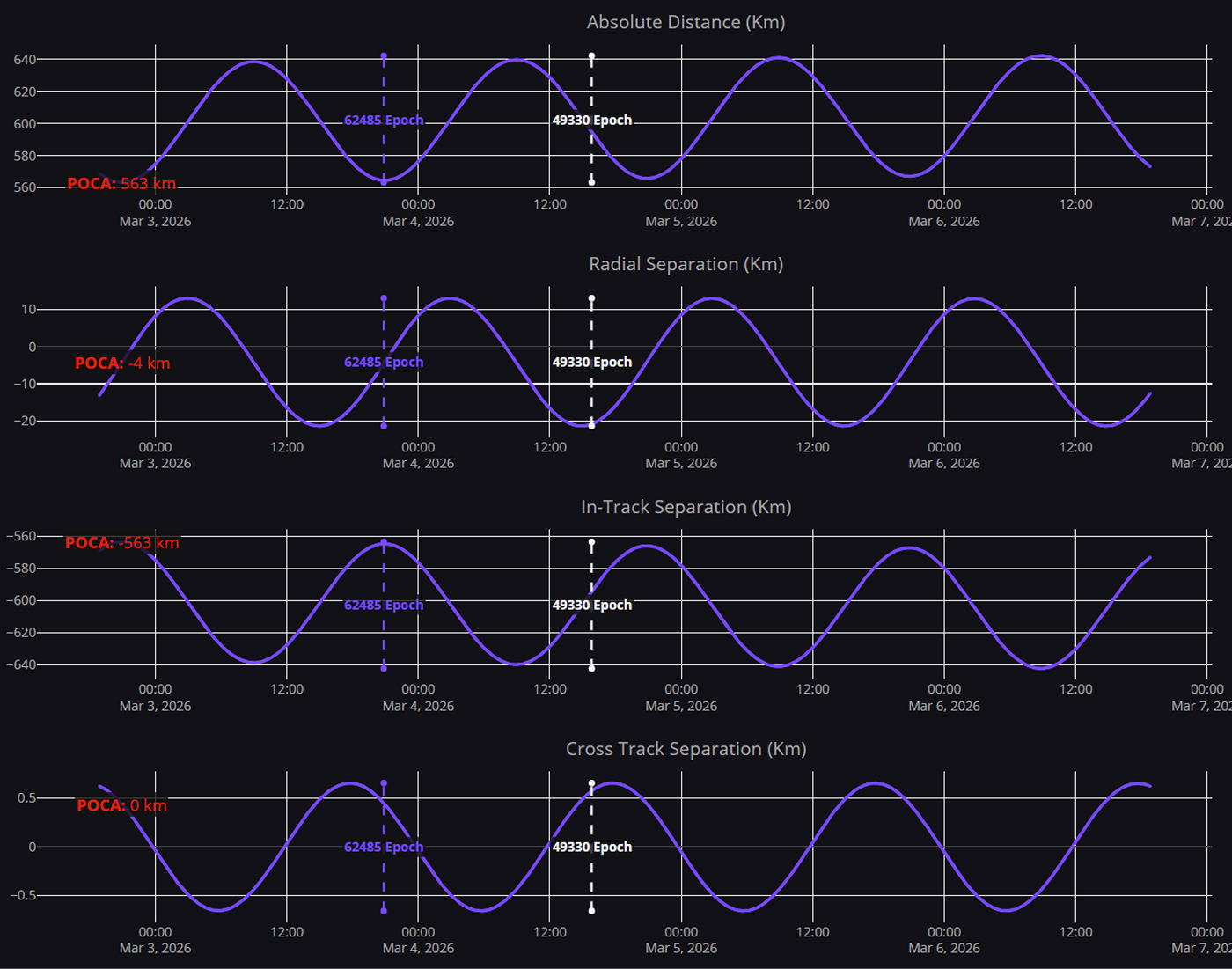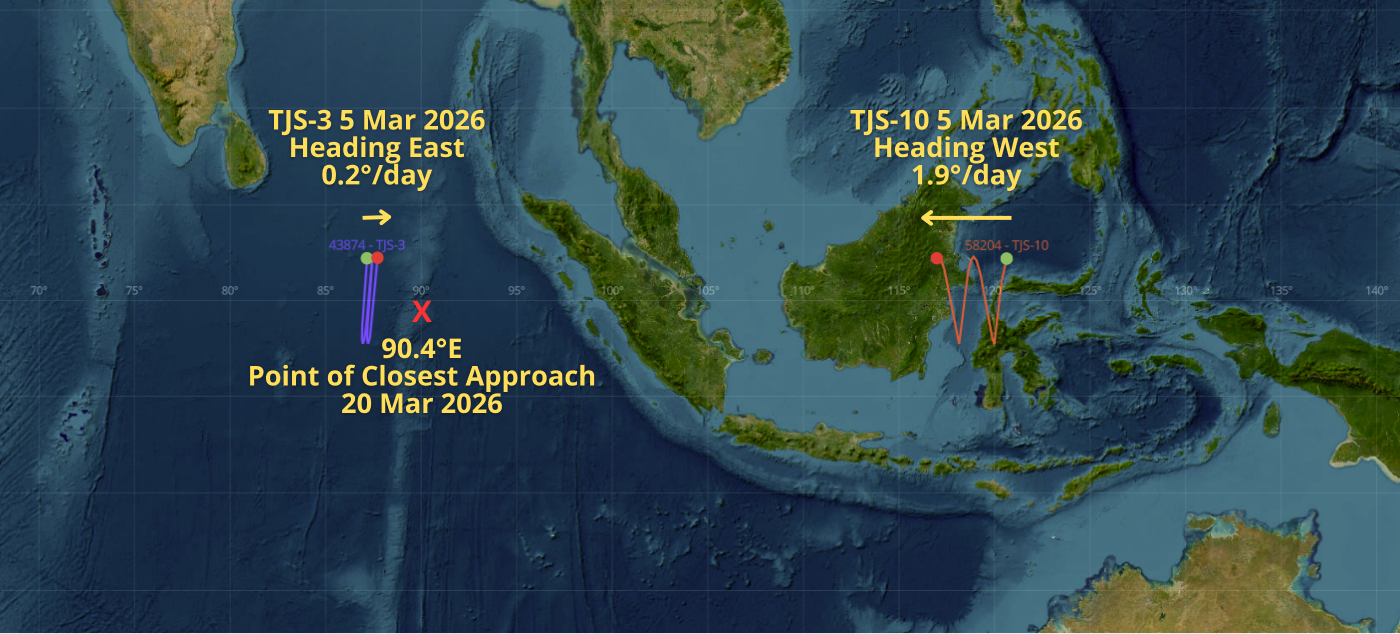 5 Mar 2026: As noted in the last edition of the Flash, Chinese space operators maneuvered both TJS-10 (58204) and TJS-3 (43874) in early February resulting in the two satellites heading toward one another. TJS-10 (58204) remains above the GEO belt and maintains a 1.9°/day westward drift. For its part, TJS-3 increased its SMA 81km on 27 Feb, slowing its eastward drift from ~1.3°/day to 0.2°/day. In their current orbits (as of 5 Mar) TJS-10 and TJS-3 are on course to have a point of closest approach on 20 Mar 2026 at ~1630Z over ~90.4°E longitude.