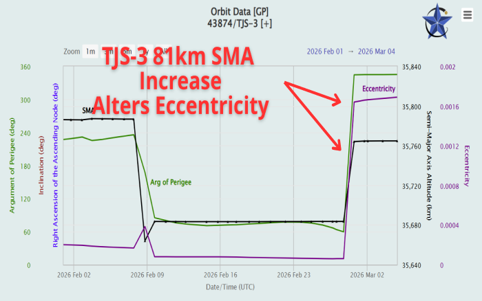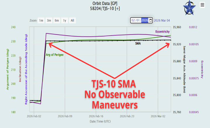 1 Feb - 5 Mar Orbital History of TJS-10 (Left) and TJS-3 (Right) TJS-10 Holding Steady after 3-4 Feb SMA Increase TJS-3 Increased SMA 81km 27 Feb 2026 Remains 21km Below GEO (celestrak.org)