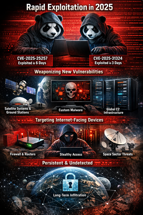 - China-linked cyber actors weaponized newly disclosed vulnerabilities within days, quickly targeting space ground systems, satellite control networks, or mission infrastructure.