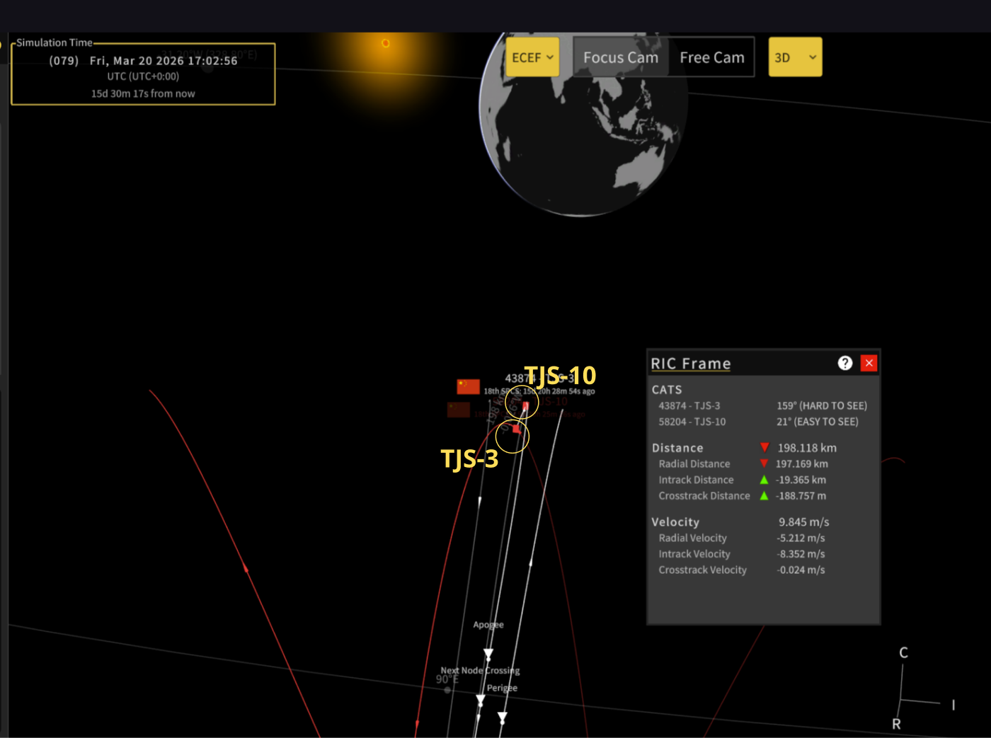 TJS-3’s most recent maneuver not only slowed its eastward drift, but also changed TJS-3’s eccentricity (orbit shape) to more closely match that of TJS-10. Prior to the maneuver TJS-3’s orbit had an eccentricity of 0.00006; post maneuver the eccentricity was 0.00169. TJS-10’s eccentricity is 0.00111. China has not aligned the Argument of Perigee for the two satellites, TJS-3 Arg of Perigee is 345.1° and TJS-10 is 234.0°. Looking at the two satellites at point of closest approach (assumes no further maneuvers) TJS-3 and TJS-10 will be separated by <1km in cross-track and in-track and just under 200km in radial-track.