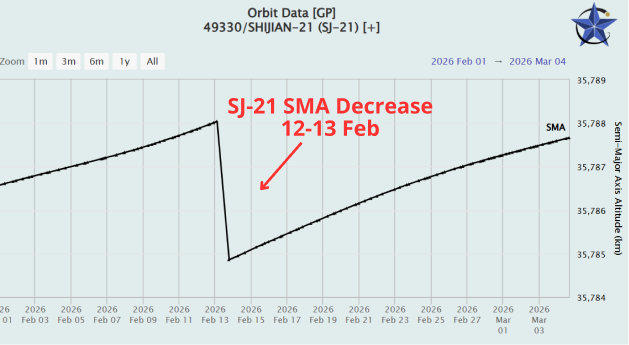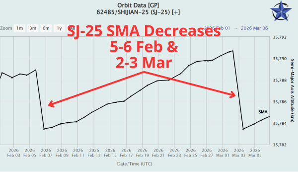 4 Mar 2026: SJ-21 (49330) and SJ-25 (62485) remain separated by ~560-640km with SJ-21 located to the east of SJ-25. The two orbits are plane-matched and the vast majority of the separation in-track. We may beginning to see a new pattern of life for both satellites. SJ-25 decreased its SMA ~5.4km on 5 Feb. About a week later, SJ-21 decreased its SMA 3.1km. On 2 Mar 2026 SJ-25 again decreased its average altitude, this time ~7.3km. It will be interesting to see if SJ-21 follows with a similar maneuver in the coming days.