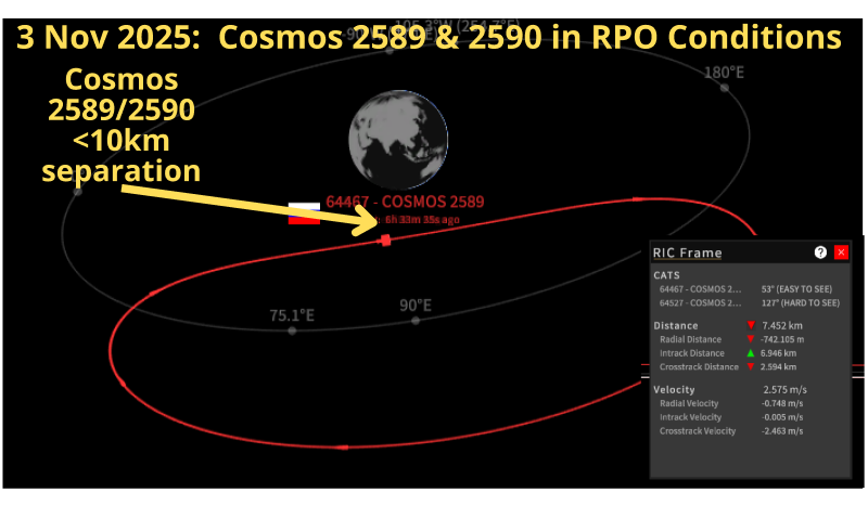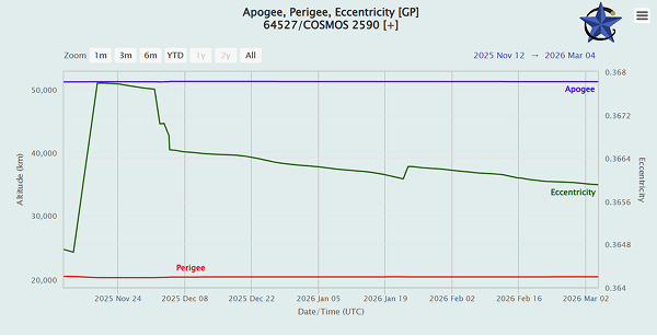 For its part, Cosmos 2590 (a sub-satellite from Cosmos 2589 released in late-June 2025) remains in a Geosynchronous Highly Eccentric Orbit. It’s perigee is 20,359km and apogee is 51,216km. Its eccentricity is currently 0.3659 compared with 0.3665 back in early December 2025.