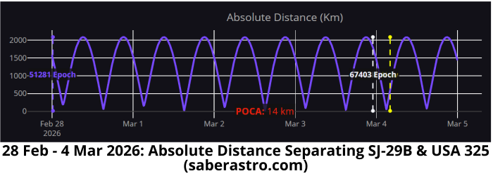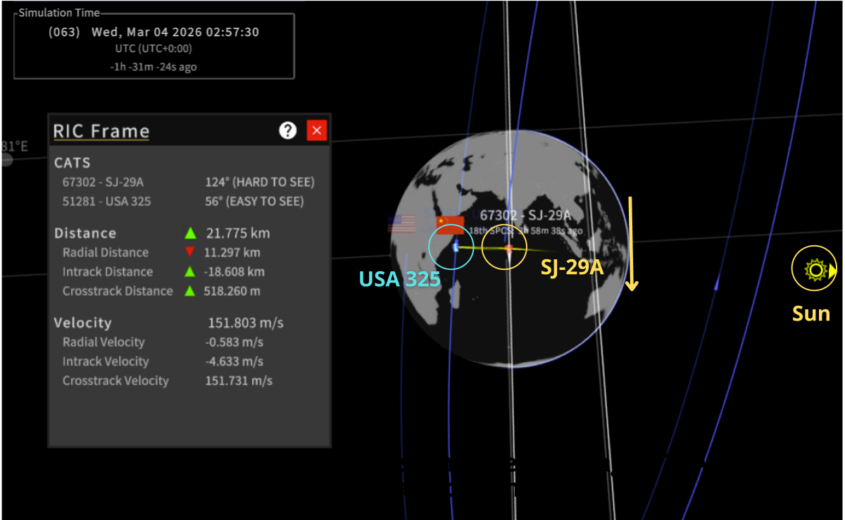 Based on TLE data from 28 Feb 2026 it appears USA 325 remains in the area. USA 325 has a close approach with SJ-29A as the pair travels from North to South and then has a close approach with SJ-29B as the pair travel from South to North. USA 325 has a close approach every twelve hours with one of the satellites. Close approach for SJ-29A and USA 325 occurs at ~0300Z with solar conditions favoring SJ-29A observing USA 325. Close approach between SJ-29B and USA 325 occurs 12 hours later (~1500Z), with solar conditions favoring USA 325 observing of SJ-29B. Examples: 2 Mar 2026 15:02Z SJ-29B was ~11km from USA 325 with optimal solar conditions for USA 325 to observe SJ-29B. On 4 Mar 2026 02:57Z SJ-29A was ~22km from SJ-29A with favorable solar conditions for SJ-29A to observe USA 325.