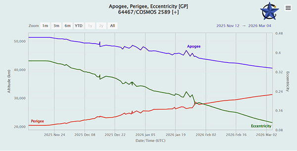 6 Mar 2025: Russia continues to maneuver Cosmos 2589 (64467) closer to a circular Geosynchronous Orbit. Russia has been regularly increasing the satellite’s perigee and decreasing its apogee resulting in a decrease in eccentricity from 0.3649 in Nov 2025 to 0.1095 in early March. During this time Cosmos 2589’s perigee has increased 10,780km and its apogee has decreased 10,772km. If Russia maintains Cosmos 2589’s current maneuver pattern the satellite will have an eccentricity of <0.01 on ~17 Apr 2026. Once Russia circularizes 2589’s orbit the satellite will have joined the Geosynchronous belt and be able to conduct inspection missions similar to the US GSSAP or Chinese SY-12 satellites.