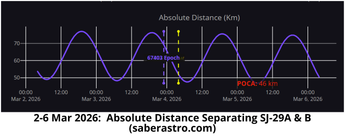 3 Mar 2026: We last updated SJ-29A/B (67302 & 67303) in the 2 Feb 2026 Flash. Recall, at that time the pair had settled into GEO at 73.0°E longitude with an inclination of 3.1°. We also noted they were joined by USA 325 (51281), one of the United States’ Geosynchronous Space Situational Awareness Program (GSSAP) satellites, which appeared to be in a favorable orbit to observe/characterize both satellites. At the time the two SJ-29 satellites were maintaining a separation of 30-70km of one another and were occasionally within 100km of USA 325.
