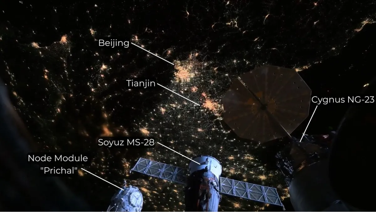 Beijing and Tianjin city spied between the solar panels of spacecraft docked aboard the ISS. (Image credit: NASA, Chris Williams, annotations by Anthony Wood) (space.com)