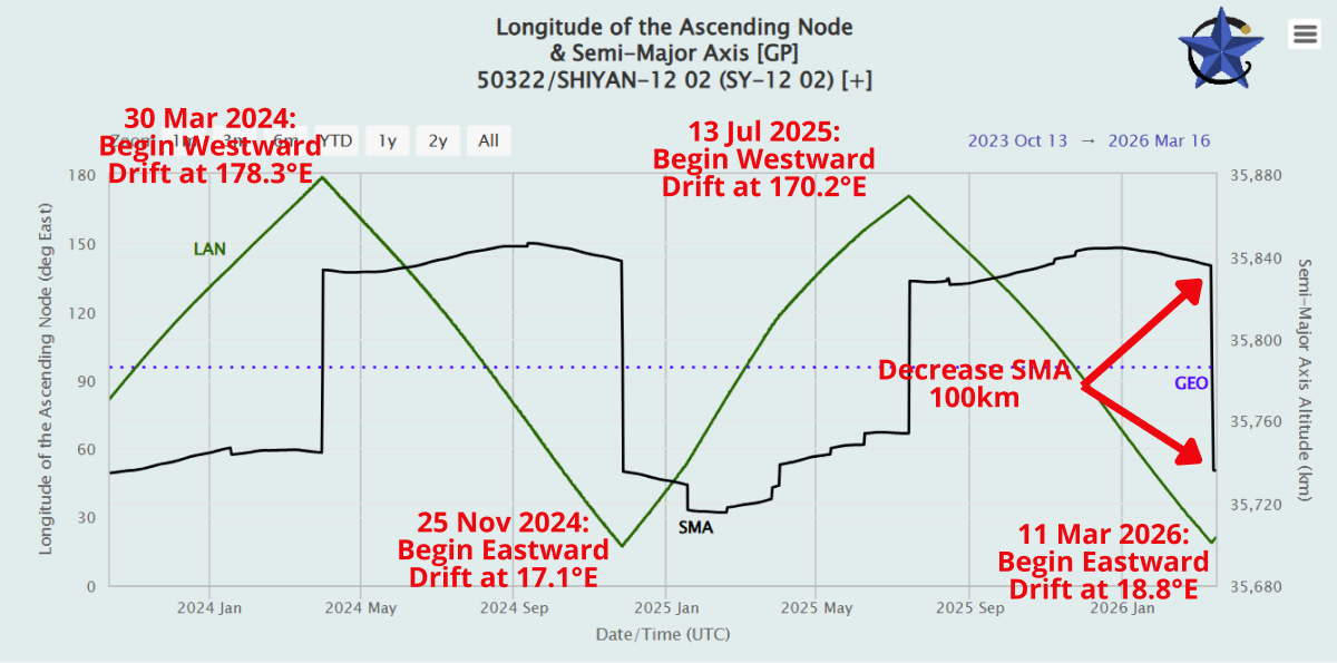 17 Mar 2026: As predicted in the 19 Jan Flash, China decreased the average altitude of its SY-12 02 (50322) inspector satellite ~100km. As a result the satellite changed from drifting west 0.6° per day and is now drifting eastward 0.7° per day. China made the maneuver as SY-12 02 approached 18.8°E, previously China had allowed the satellite to move as far west as 17.3°E. If China maintains previous patterns, SY-12 02 will drift eastward for the next 8-9 months and reverse course when it arrives at ~175°E longitude. Average leg for SY-12 satellites is 244 days. Check out COMSPOC Video!