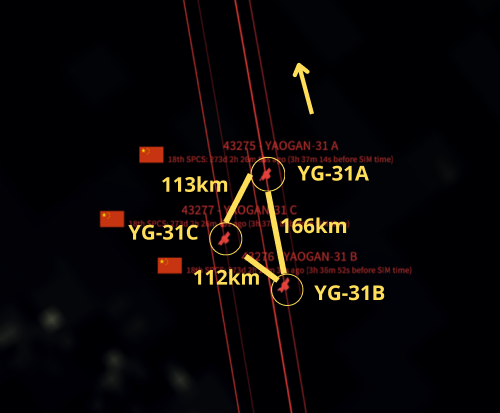 YG-34 04 (56157), the imagery satellite trailing YG-31A/B/C is also no longer maintaining its relative position. All three of the other YG-31 formations remain intact.
