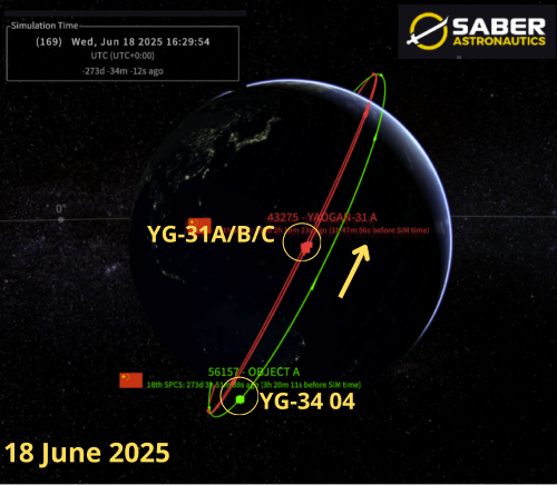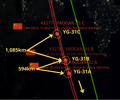 18 Mar 2026: The Yaogan-31 A/B/C (43275, 43276, 43277) triplet has fallen out of formation. China launched the trio on 24 Feb 2021 and soon thereafter the satellites maneuvered into their isosceles triangle formation to conduct their RF detection/Geolocation (ELINT) mission. In June 2025 the satellites were maintaining this formation, however over the next 2 months this began to slowly change. YG-31C has a west RAAN offset with A & B and is normally equal distance between the two (see graphic). Between 10-15 Aug 2025 31C’s position relative to A & B began to change with C slowly falling behind the other two satellites. By 20 Sep 2025 31C had fallen completely behind 31B. China has not reversed the pattern and the satellites continue to slowly increase their distances from one another & likely not able to perform their mission. Reviewing the orbital history for all three satellites, there is no obvious failure and all remain at the same SMA (1,089.0km). It appears China has stopped maintaining the formation for unknown reasons.