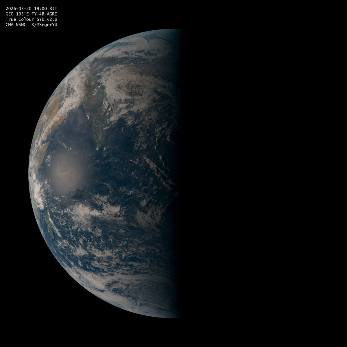 “Beijing time today 22:46, the spring equinox in the Northern Hemisphere in 2026, with the sun directly shining on the Earth’s equator. The image is from the Fengyun-4B satellite, located in geostationary orbit at 105° East longitude”