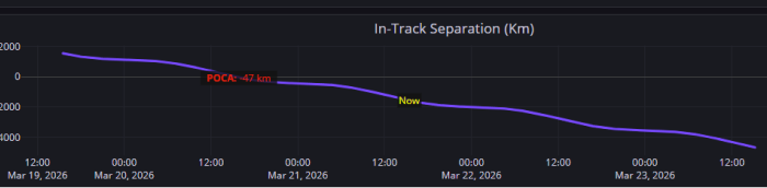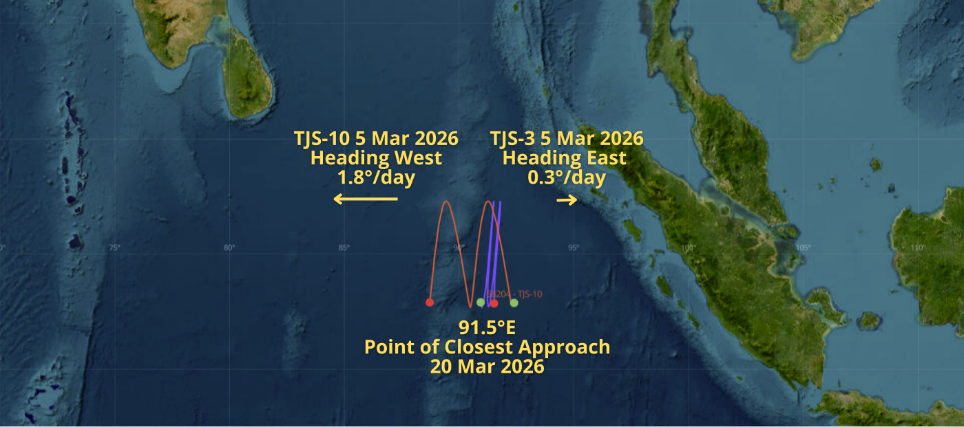 21 Mar 2026: At ~1550Z on 20 Mar, TJS-10 (58204) and TJS-3 (43874) passed one another in GEO over ~91.5°E longitude. Neither satellite maneuvered (at least as of 1600Z on 21 Mar) and TJS-10 continues to head west while TJS-3 creeps eastward. Many will recall that Chinese space operators maneuvered both satellites in early February 2026 resulting in the two satellites heading toward one another. At the point of closest approach (POCA) the satellites were ~220km apart with the majority of the separation due to differences in radial track. At POCA TJS-3 had ideal lighting conditions for imaging TJS-10, although with ~220km of separation it seems unlikely China intended to collect high-resolution imagery of either satellite. The satellites remain plane matched (nearly identical inclination and RAAN).